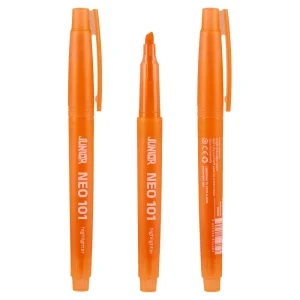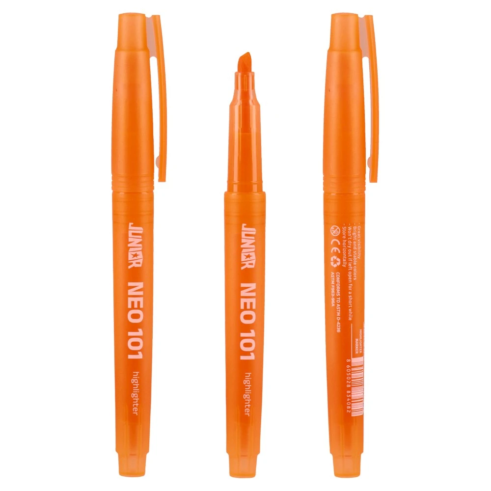 101 Neon, highlighter, narrow, orange. Slim, modern barrel with pocket clip and cap. Bright neon orange for clear emphasis. Narrow chisel tip delivers precise underlining and controlled coverage. Durable plastic construction. Trendy all-orange design enhances shelf appeal.