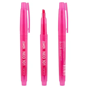 101 Neon, highlighter, narrow, pink. Sleek neon-pink design with translucent plastic barrel and cap with clip. Narrow chisel tip delivers precise marking and clean lines. Bold color stands out on documents and on shelf, making it an attractive, quality choice for modern offices.