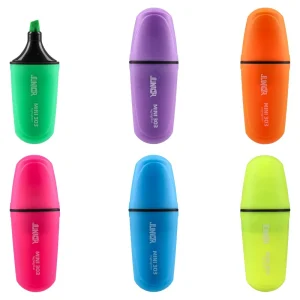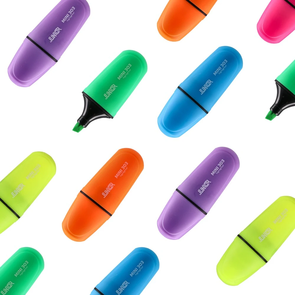 Compact mini highlighters in a mixed color range. Trendy capsule design with durable plastic body and a chisel tip for broad or fine marking. Space-saving, pocket-friendly, and easy to merchandise for offices, schools, and promotional kits.