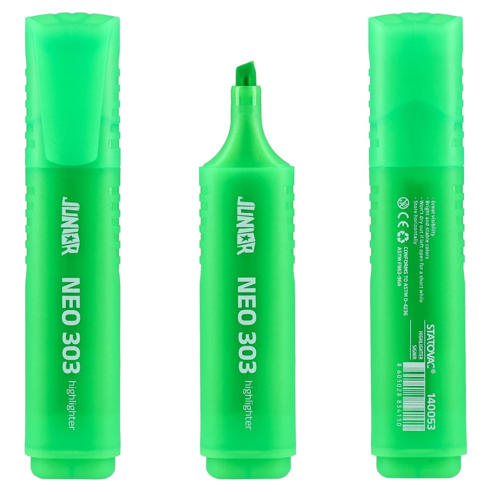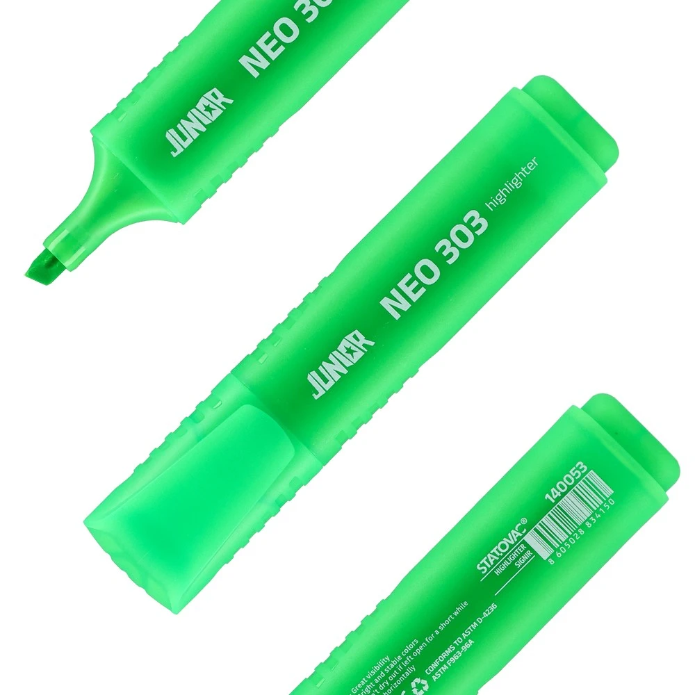303 Neon, highlighter, wide, green. Bright neon-green chisel tip delivers broad, consistent coverage for clear emphasis. Translucent plastic barrel with matching cap offers a modern look and secure, wide grip. Durable build suited for high-visibility document marking.
