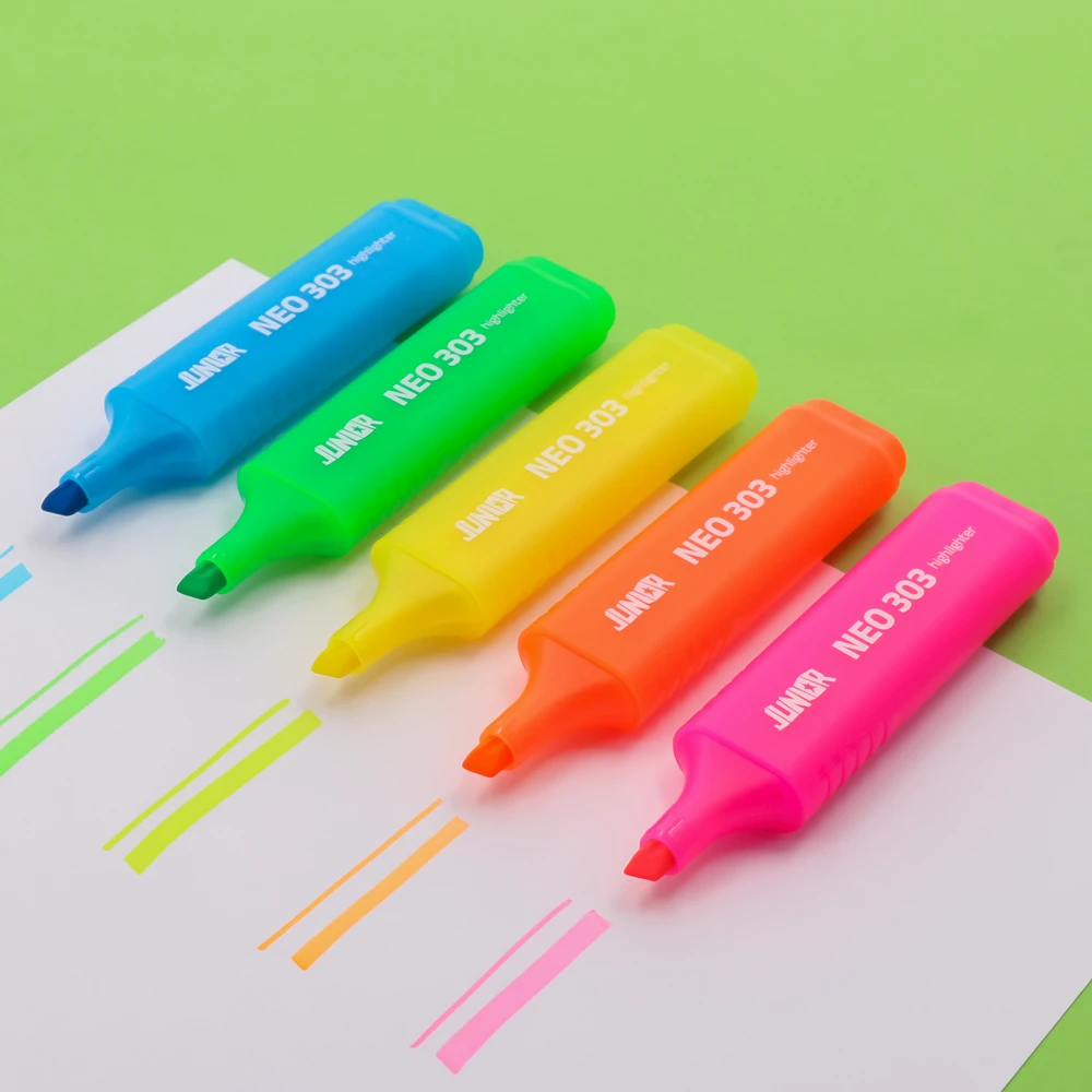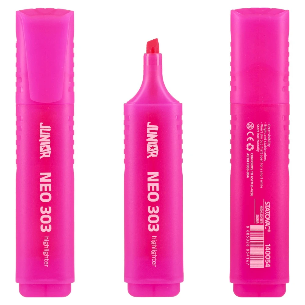 303 Neon, highlighter, wide, pink. Contemporary neon design with a sturdy plastic barrel. The wide chisel tip lays down bold, even color for fast coverage and clear emphasis. High-visibility pink ink enhances readability and shelf appeal for offices, schools, and retail.