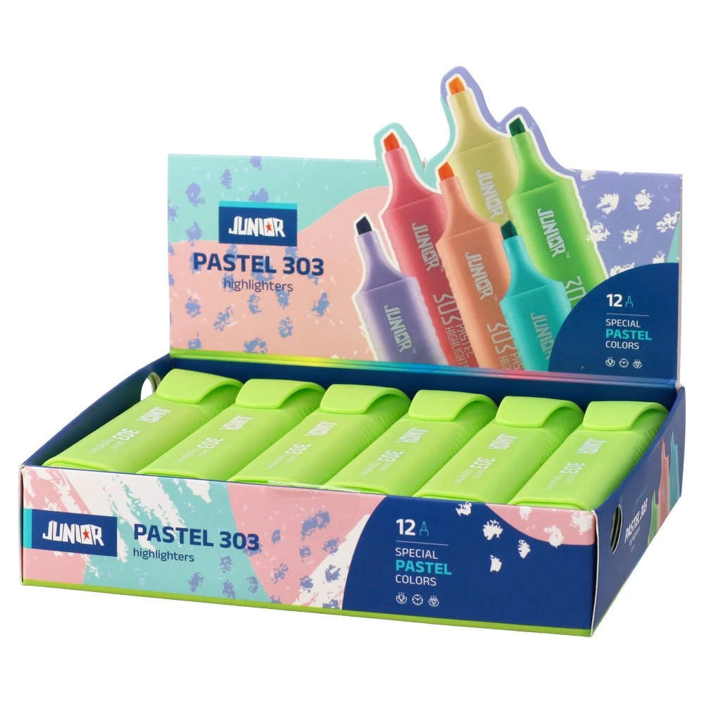 The 303 Pastel highlighter in pastel green features a wide chisel tip for solid fills and precise underlines. Its soft, modern tone delivers clear emphasis. Durable plastic body with a textured grip supports steady control. A stylish, sellable choice for offices and education.