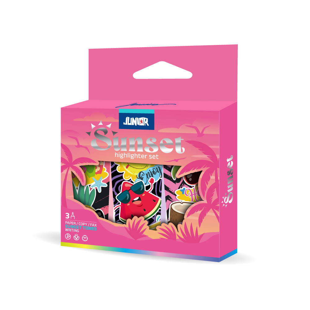 309 Mini highlighter set, 3 pcs, in a trendy Sunset theme. Compact barrels with vibrant tropical prints, presented in a windowed box for strong shelf impact. Portable size for bags and desks, ideal for back-to-school assortments and impulse sales, delivering reliable everyday highlighting.
