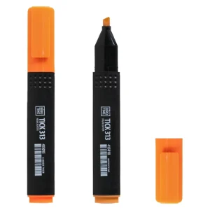 313 Tick highlighter, orange. Black, flat-sided plastic barrel with vivid orange cap and chisel tip. Textured grip for control; the chisel edge handles broad highlights and fine underlines. Contemporary contrast look suits modern offices. Printed barcode supports efficient stocking.