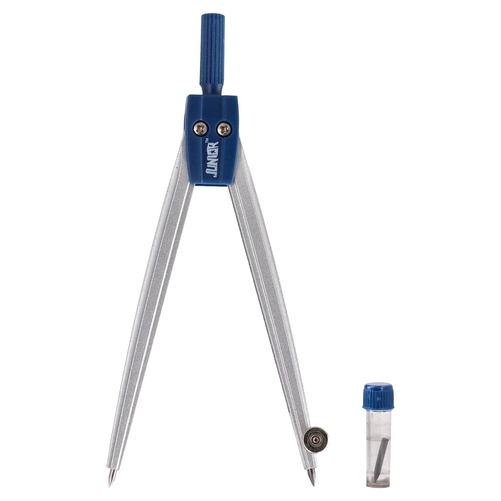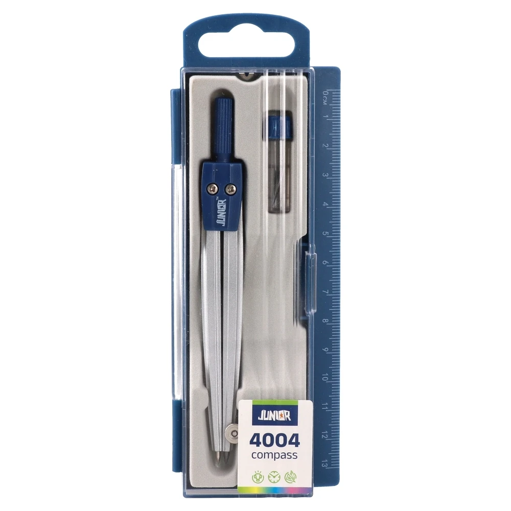 4004 compass, blue: durable metal legs with a secure joint for reliable circle drawing. Presented in a clear protective box with hang tab and a side cm ruler. Includes a spare lead tube. Trendy blue accents enhance visibility and shelf appeal for education and drafting use.
