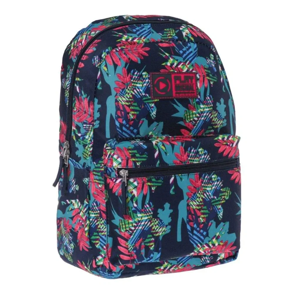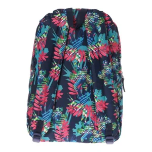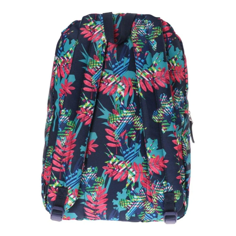4Pack, backpack, X11. Trend-forward design with a dark base and vibrant tropical print. Sturdy fabric, clean construction, and metal zipper pulls. Features a spacious main compartment and a front zip pocket. Eye-catching, quality piece suited to youth and lifestyle retail mixes.