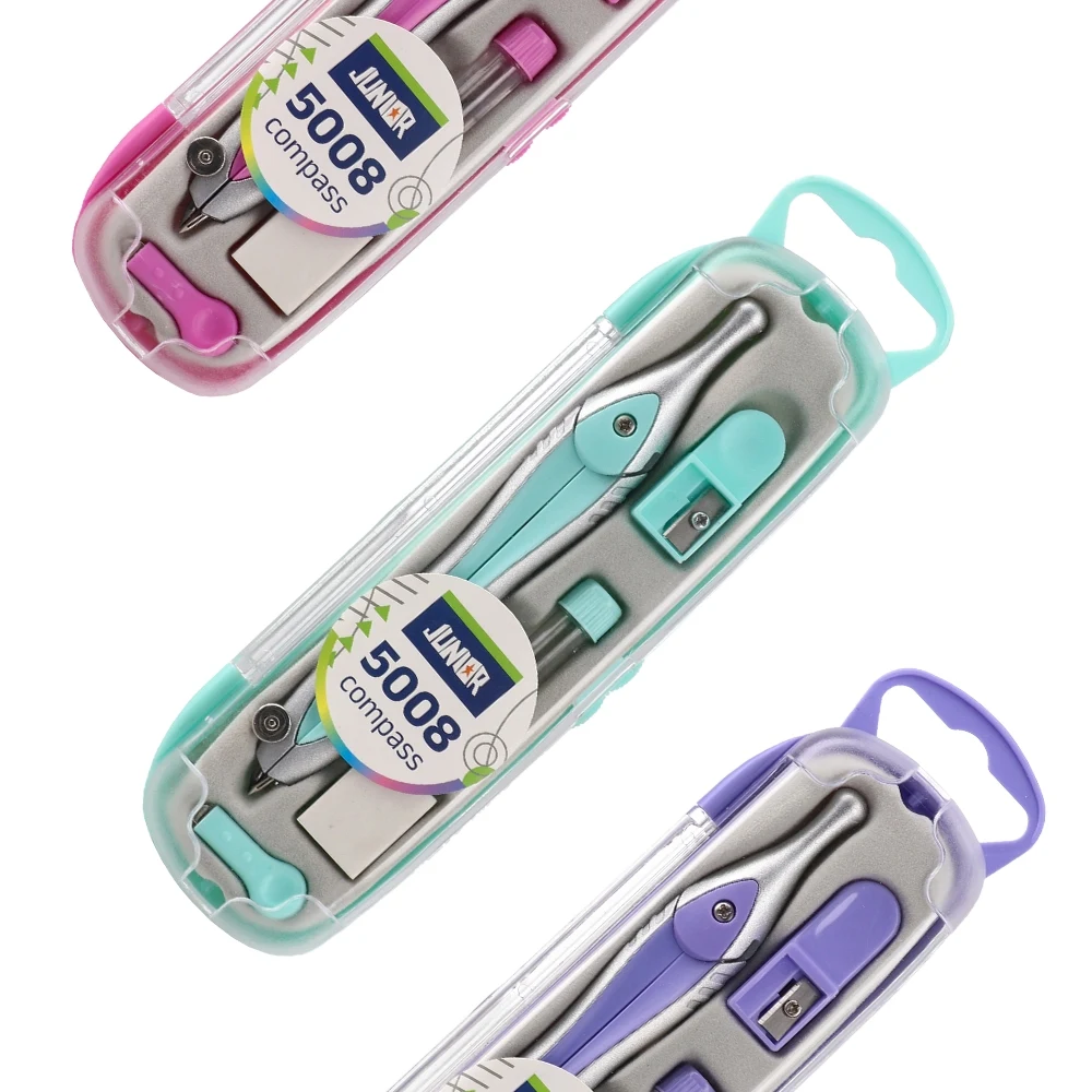 5008 compass in clear storage box, pastel mix. Robust metal-and-plastic build with contoured grip and precision needle for reliable drawing. Trendy pastel finishes boost shelf appeal. Compact case with secure closure and hang tab for retail-ready display, ideal for school and office supply lines.
