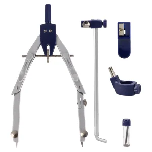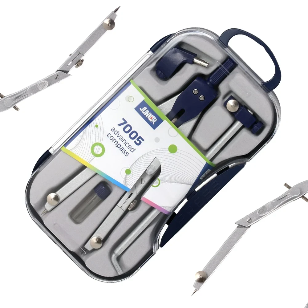 7005 metal compass set with parts, supplied in a protective box. Solid metal legs and a modern two-tone finish. Includes attachments and a tube of spare leads. Clear-lid hard case with carry handle keeps components organized for drafting and technical drawing.