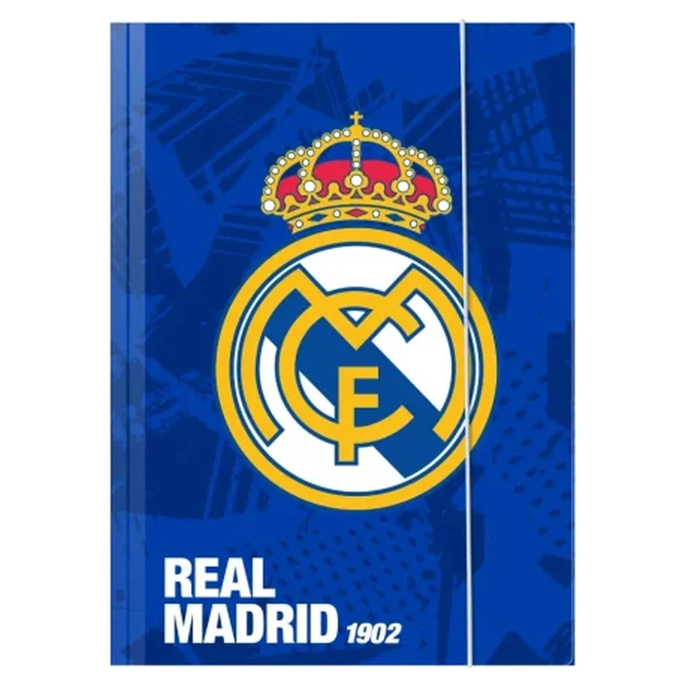 Apex 10 A4 folder with elastic band, showcasing a bold Real Madrid crest on deep blue. Elastic closure secures papers in transit; A4 format fits standard documents. Trend-led club design boosts sell-through for school and office ranges, portfolios and handouts.