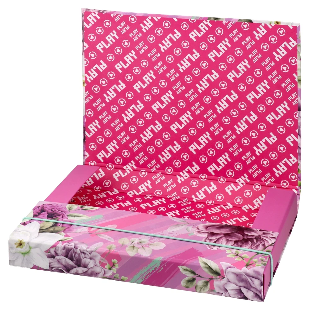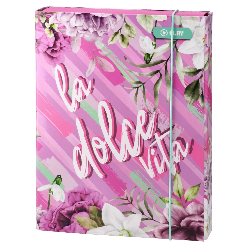 Apex 40 folder with elastic band for secure, neat storage. Trendy pink and purple floral artwork with “la dolce vita” lettering boosts shelf appeal. Sturdy box-style construction and elastic closure protect documents and keep contents in place—ideal for coordinated, stylish filing.