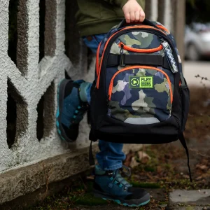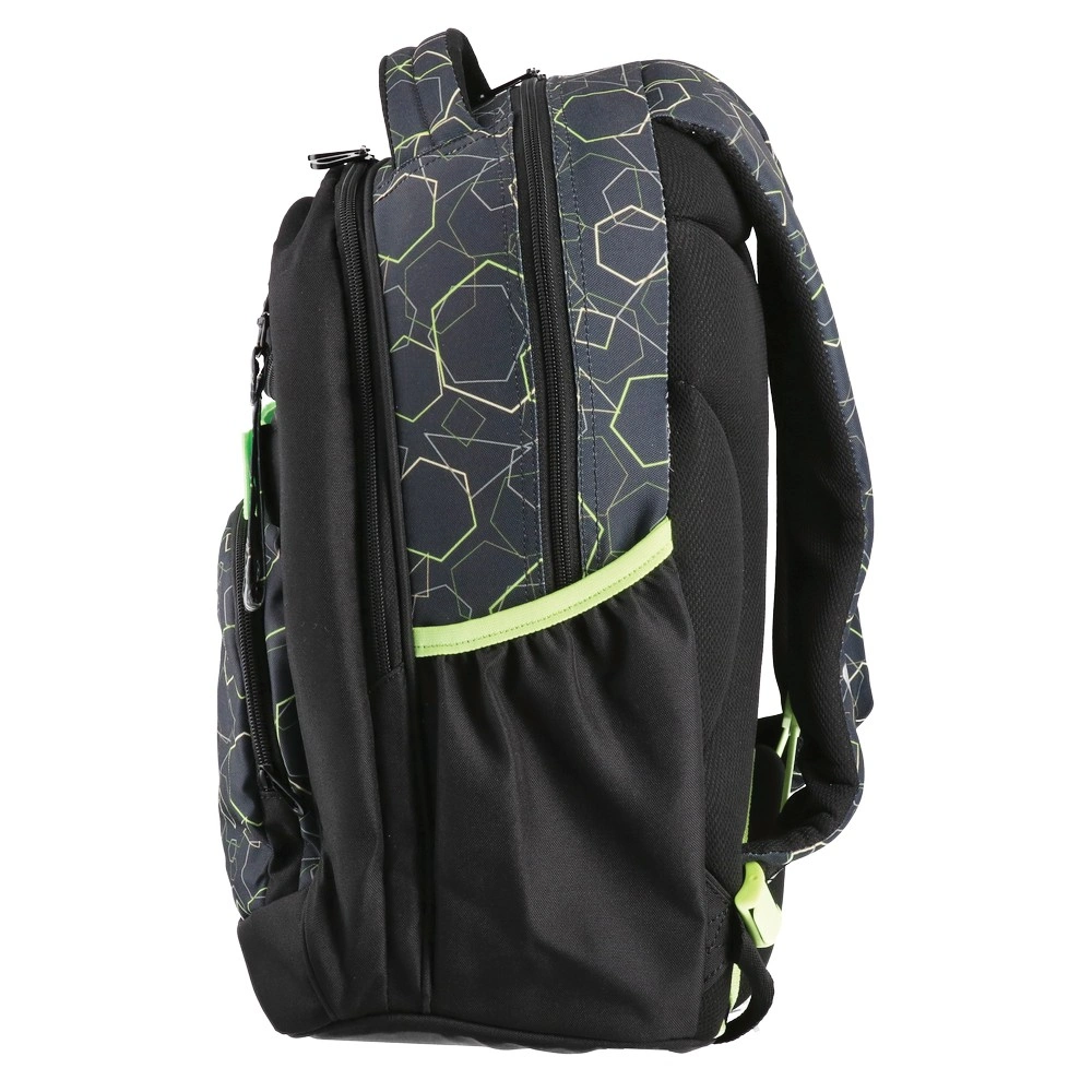 Apollo 243 stands out with a modern hexagon print and neon accents. The structured design offers multiple zipped compartments, a front utility strap, top carry handle, side pocket, and a reflective detail. Durable fabric and smooth zippers ensure reliable daily use and strong retail appeal.