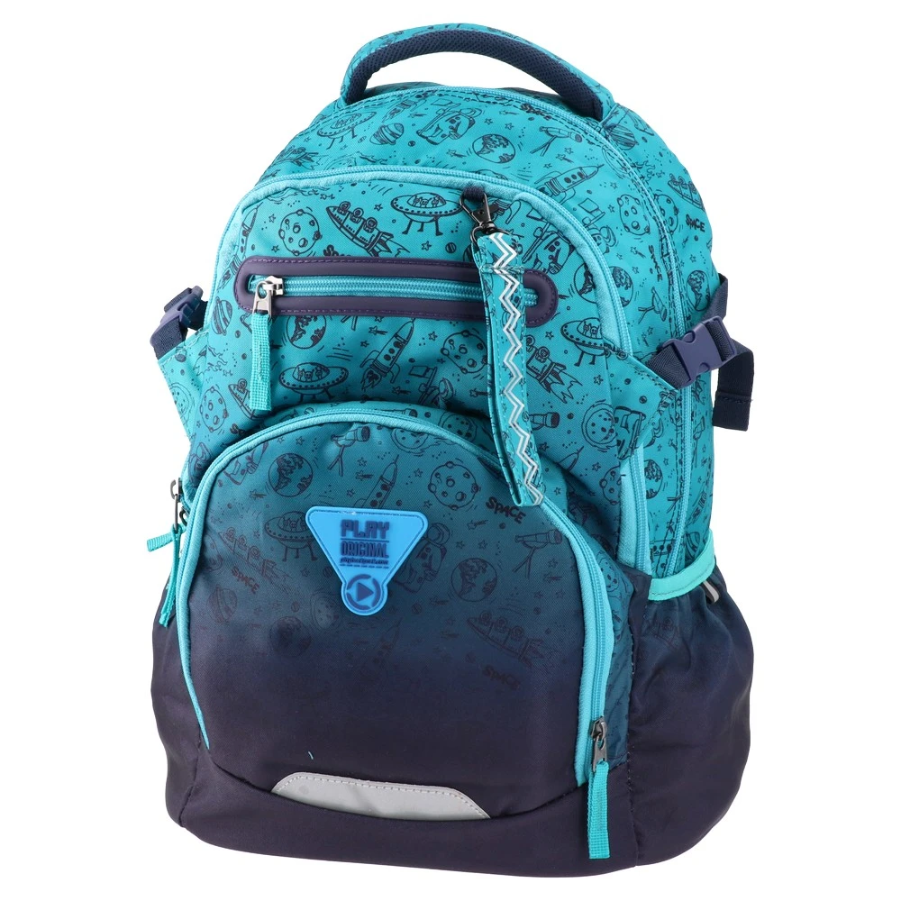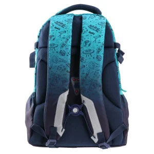 Apollo 251 backpack ergo, sunset blue–navy. Trendy space-print design with a gradient finish. Durable fabric, sturdy zippers, and a padded carry handle. Multiple zip compartments, front pocket, elastic side pocket, and side compression straps. Reflective detail for visibility.