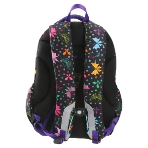 Apollo 263, backpack ergo, Butterfly. Trend-forward black backpack with multicolor butterfly print. Durable fabric, contrasting zips, padded top handle. Multiple zip compartments, front elastic cord lacing, and side pockets. Strong visual appeal for school and casual markets.