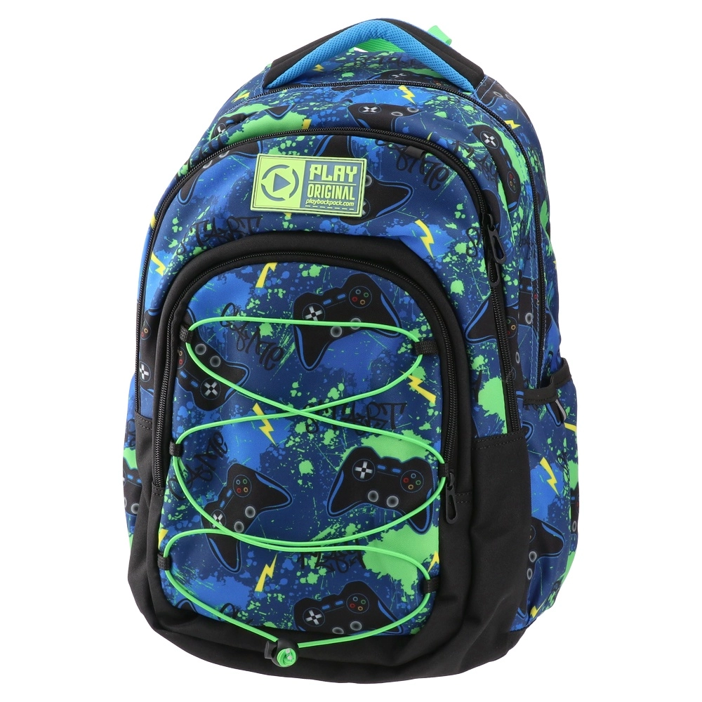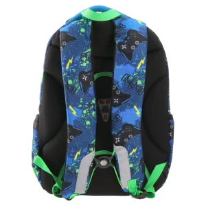 Apollo 263, backpack ergo, Gaming brings a trendy gamer aesthetic with bold blue/green controller graphics. Multi-compartment layout, front pocket with bungee cord, side pockets, and a padded top handle support daily use. Eye-catching design maximizes shelf appeal and ergonomic carry.