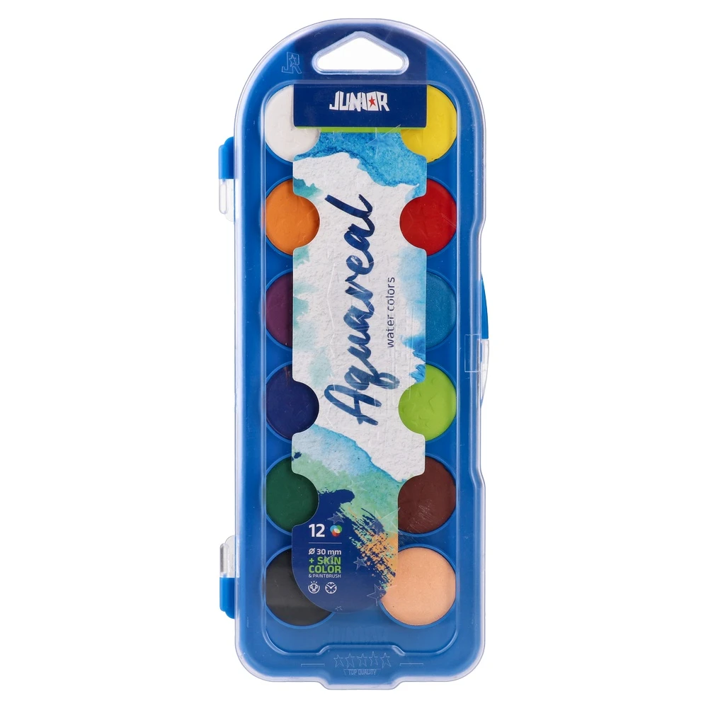 AquaReal watercolors, 12pcs. Set of 12 large 30 mm pans, including a skin tone, in a sleek blue plastic case with clear lid and secure latch. Hang-ready design maximizes shelf impact. Portable, reusable palette with vivid colors for classrooms, workshops, and kits.