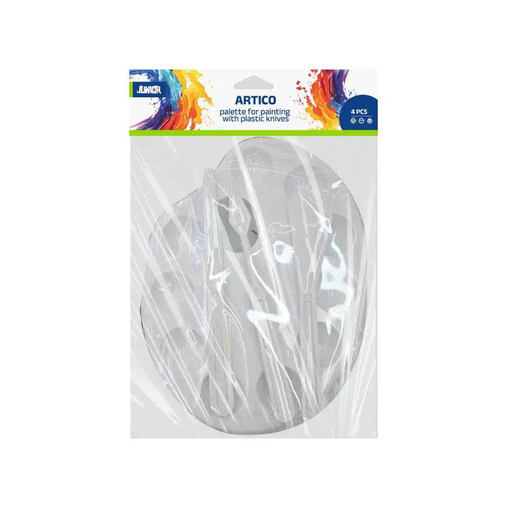Artico palette knives set with 4 white plastic tools for painting and texture work. Lightweight construction enables smooth spreading and mixing. Assorted shapes support varied techniques. Clear hang‑tab packaging ensures clean presentation and efficient merchandising.