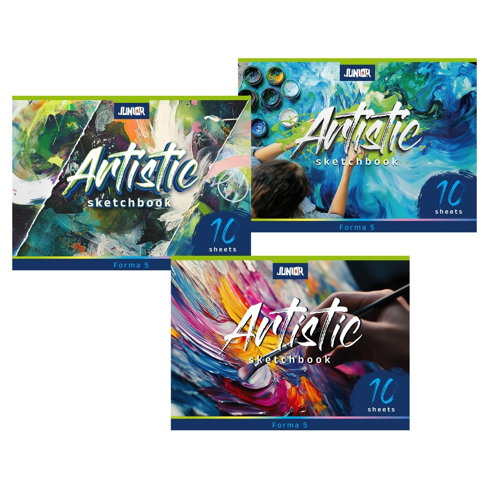 Artistic sketchbook No 5 with 10 sheets. Assorted art‑inspired covers in a landscape format deliver modern shelf appeal and a clean presentation. Paper pages suited for sketches, drafts, and notes. A practical choice for classrooms, studios, and retail assortments.