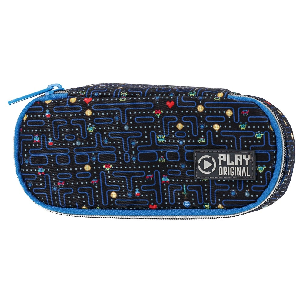 B32, pencil case, Run: Trend-forward zip-around case with an arcade-style maze print on a dark fabric finish. Compact oval profile with blue piping and matching zipper for a clean look. Play Original badge boosts shelf appeal. Suitable for pens and small accessories.