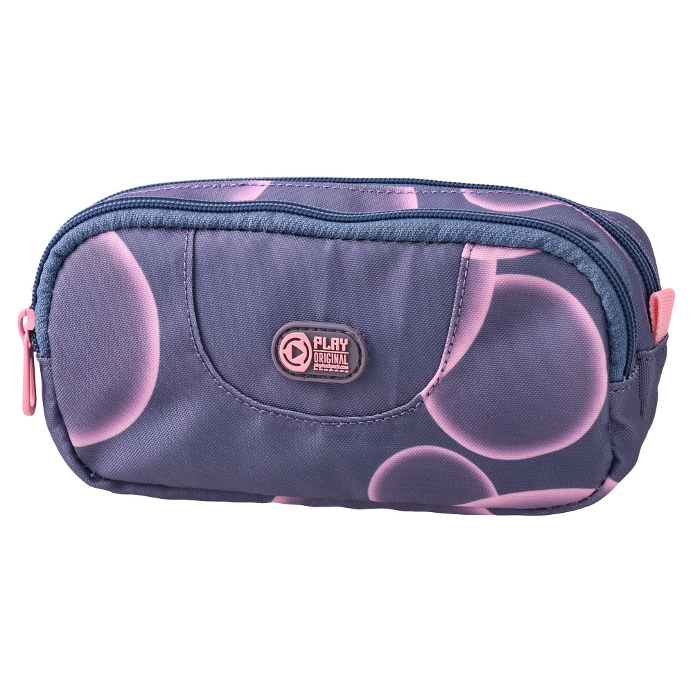 B64 pencil case, empty, Bubbles. Trendy bubble print in violet and pink with contrast zippers. Compact, durable fabric and clean stitching. Two zip compartments for pens and small accessories. Quality hardware and neat finish make it a strong retail seller for school or office.