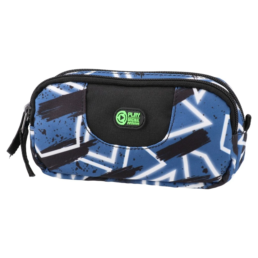 B64, pencil case, empty, Shapes. Trendy zip pouch with blue geometric print and black brush-stroke details. Durable fabric shell with full-length zipper and easy-grip puller. Compact format for pens and small tools. Clean finish and bold graphics deliver strong shelf impact.