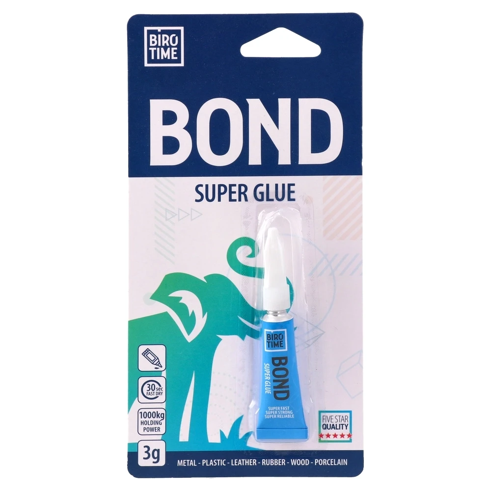 Bond Super Glue, 3g. Modern, shelf-ready packaging with clear branding. Dries in 30 seconds and is rated to 1000 kg holding power for dependable repairs. Bonds metal, plastic, leather, rubber, wood and porcelain. Compact nozzle tube supports controlled application. Five-star quality.