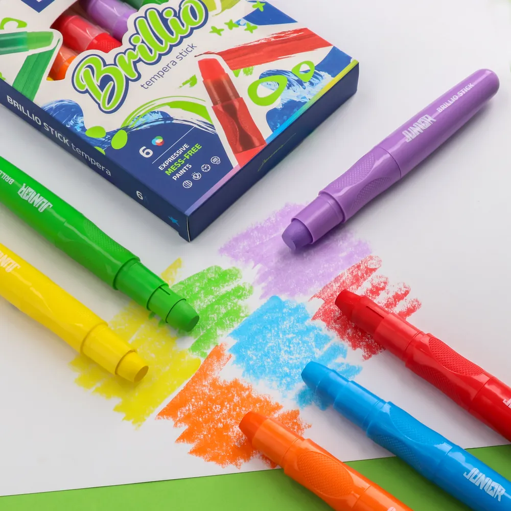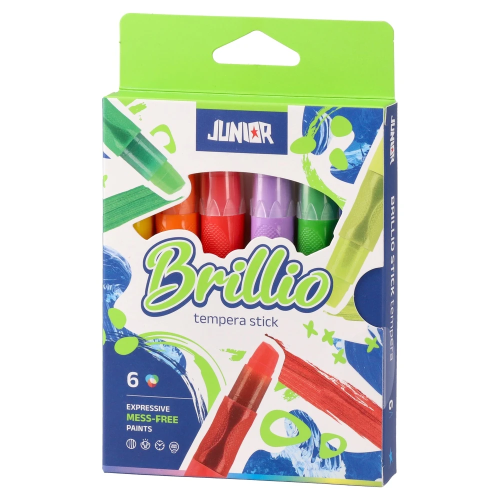 Brillio stick, tempera stick, 6pcs offers vibrant, mess-free paints in a compact retail pack. Six assorted colors in durable plastic barrels with textured grip, visible through a windowed box with hang tab. Trendy, colorful design boosts shelf impact and sell-through.