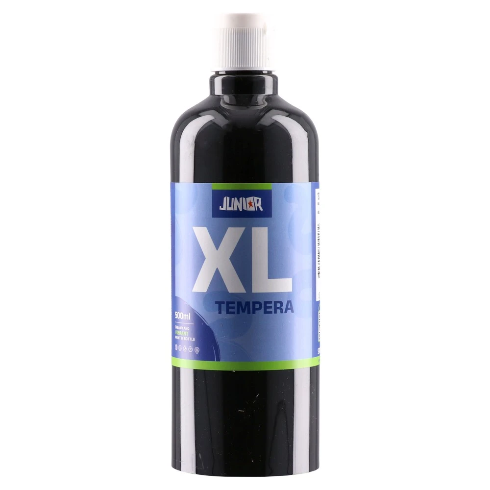 Brillio XL, tempera, black, 500ml. High-volume tempera for classrooms, studios and workshops. Packed in a sturdy plastic bottle with a clean, contemporary label for strong shelf impact. Practical for frequent use and stocking needs, delivering consistent black coverage.