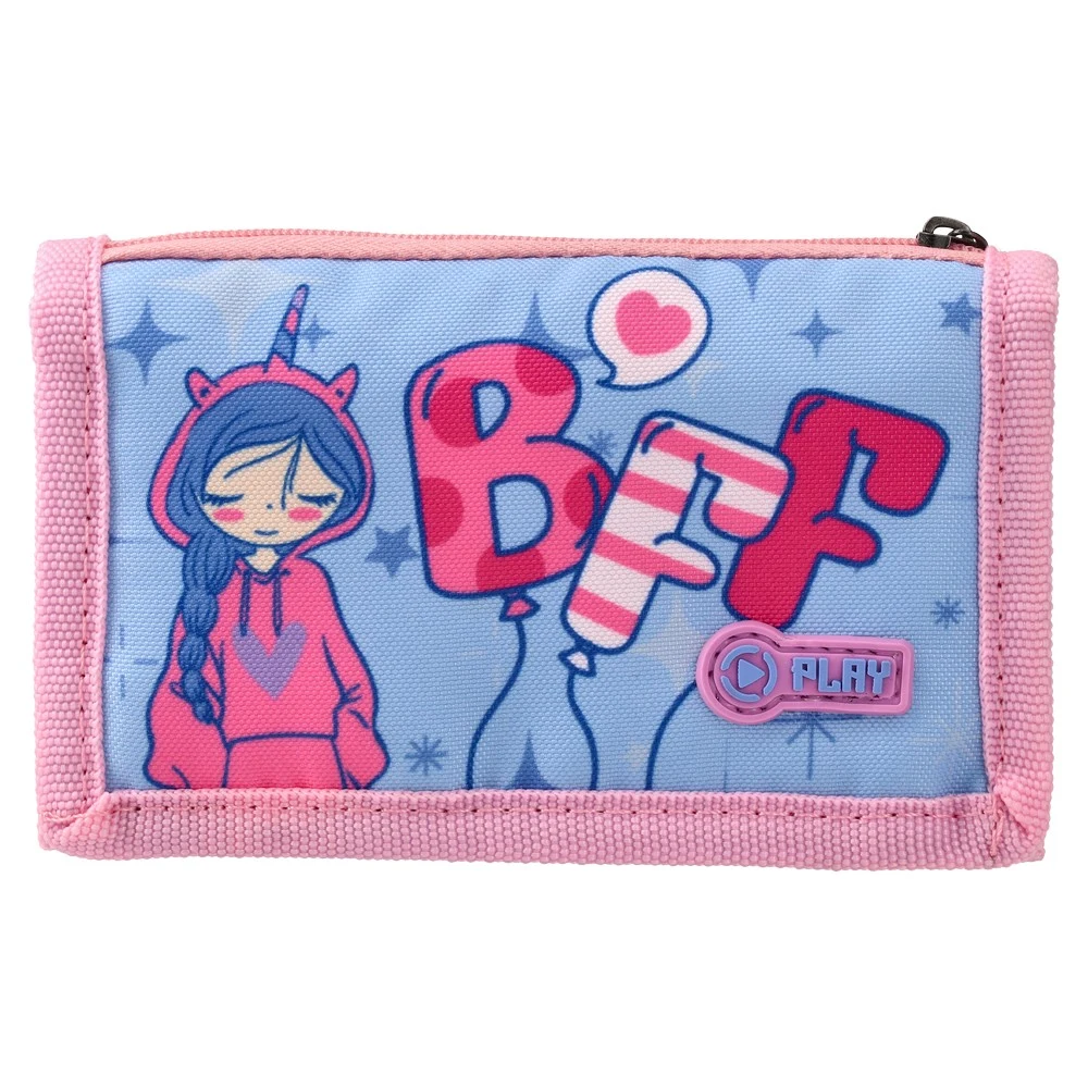 Trendy kids wallet with BFF balloon artwork and a unicorn‑hoodie character on pastel blue with pink trim. Durable fabric construction with reinforced edges and a side zip pocket. Eye‑catching, giftable piece that delivers strong shelf appeal for kids’ accessory and back‑to‑school assortments.