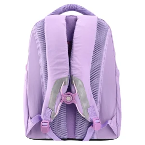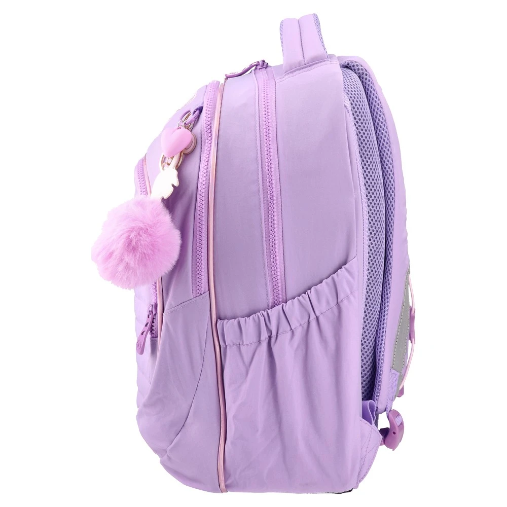 Celest anatomic backpack in purple delivers a modern pastel look with contrasting pink piping. Built from durable fabric, it features dual front zip pockets, quilted stitching, a padded top handle, smooth zippers, and a removable pom‑pom charm. Reflective detail enhances visibility.