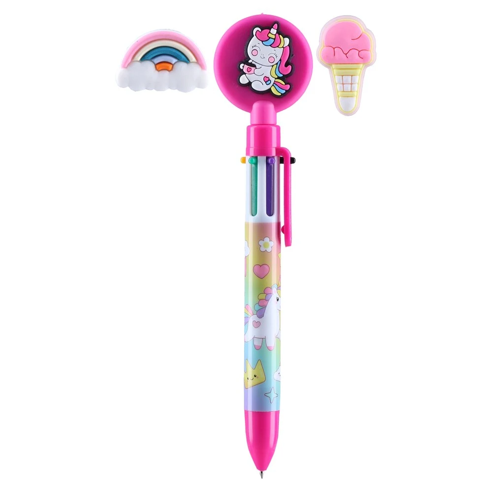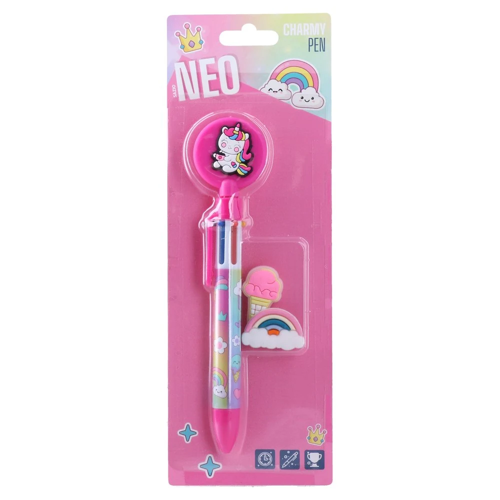 Charmy multicolor pen with unicorn theme and playful charms. Pink plastic barrel with pastel rainbow graphics and a unicorn topper; includes two additional charms (ice cream and rainbow). Eye-catching and giftable, retail-ready blister packaging for strong shelf impact.