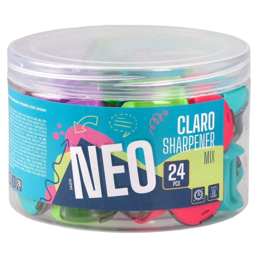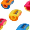 Compact single-hole sharpener in a vibrant color mix. Features a translucent hinged cap and integrated shavings container to keep desks clean. Durable plastic body with metal blade. Trend-forward rounded form boosts shelf appeal for school and office assortments. Compact size fits pencil cases.