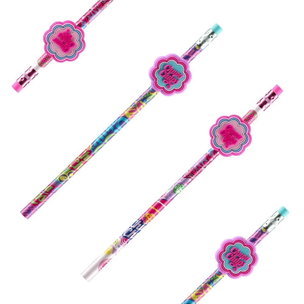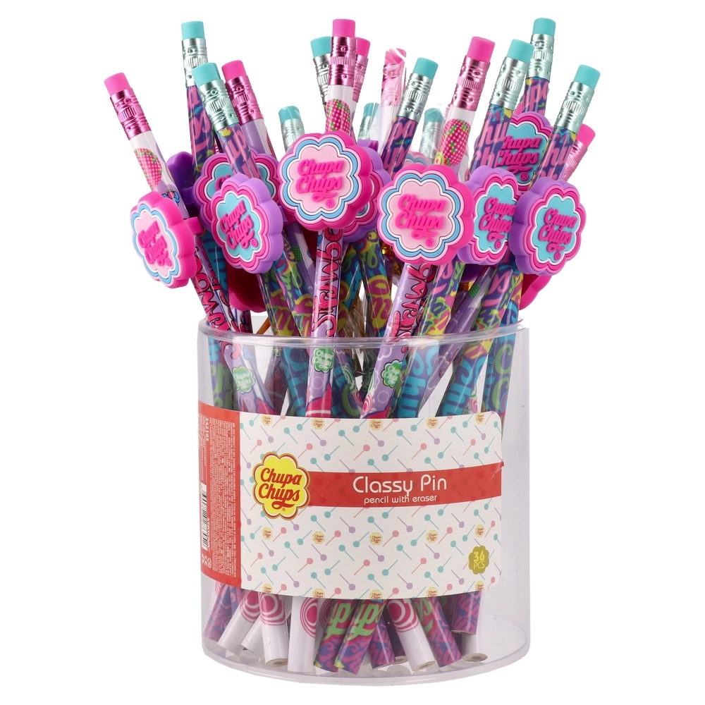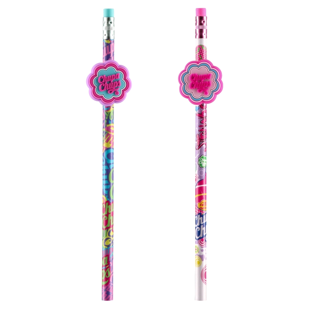 Trendy Chupa Chups pencils featuring vibrant all-over prints in assorted designs and a flower-shaped logo charm. Each includes a top eraser with metal ferrule. Eye-catching and giftable, ideal for school assortments, back-to-school promos, or impulse retail placements.
