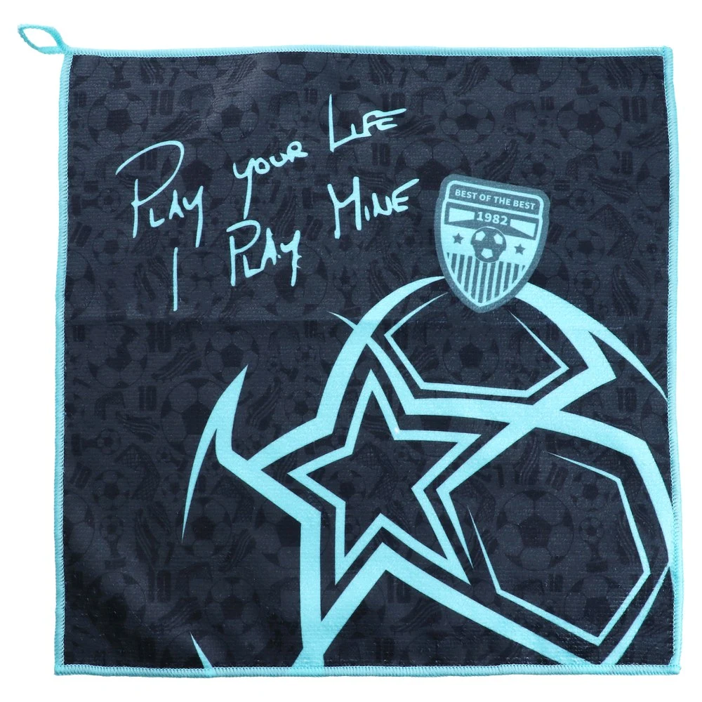 Cleanyx, wiping cloth, 30x30cm, Legendary Football. Bold black/aqua graphic with star-ball motif, crest and slogan, finished with contrast stitched edging for durability. Compact, soft-feel cloth for quick wipe-downs. Modern sports styling boosts shelf impact and sell-through.