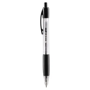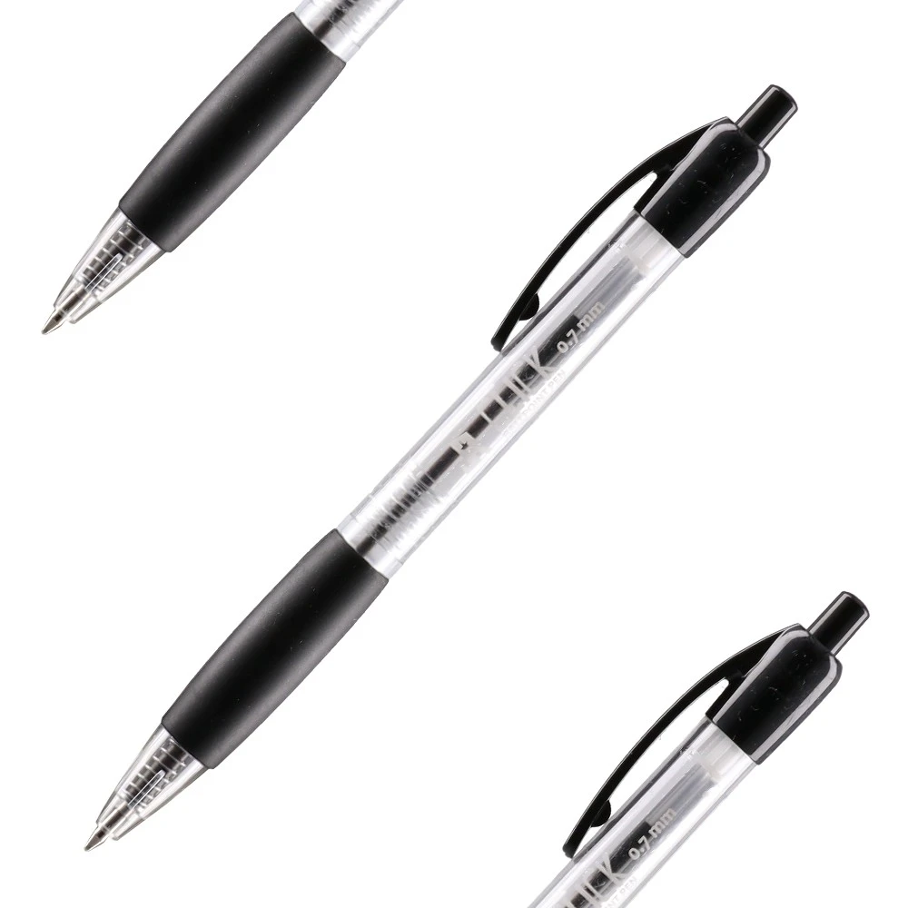 Retractable ballpoint, 0.7 mm, black ink. Clear barrel displays refill; black clip and click top. Metal conical tip and rubberized grip provide control. Trendy, minimal design and sturdy plastic construction suit high‑volume office use and promotional needs.