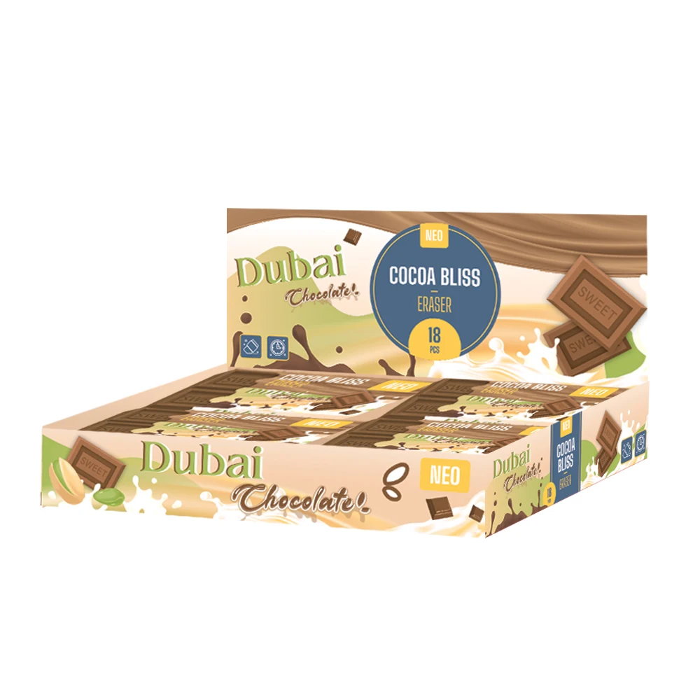 Dubai Chocolate Cocoa Bliss eraser features a trendy chocolate-bar aesthetic with segmented blocks and SWEET embossing. The realistic look and neat sleeve packaging drive strong shelf appeal for school, office, and gift channels while delivering a fun, functional addition to stationery assortments.