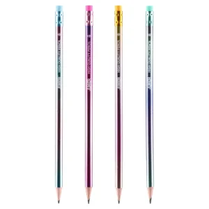 Colores metallic pencil with a sleek gradient barrel in assorted colors for a modern, eye-catching look. Wood-cased graphite delivers smooth, consistent marks. Each pencil includes a colored eraser secured by a metal ferrule, enhancing durability and merchandising appeal.