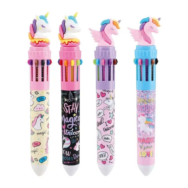 Colorito ballpoint pen, multicolor, Unicorn. Trend-led plastic pen with 3D unicorn topper and assorted printed barrels. Side sliders switch between multiple ink colors. Sturdy build and vivid looks drive impulse sales—ideal for kids’ stationery ranges, gifts and promotions.