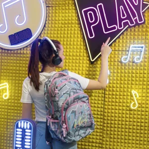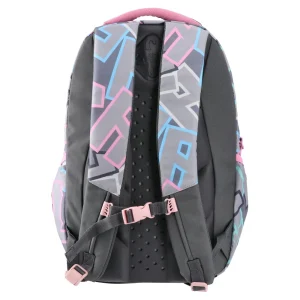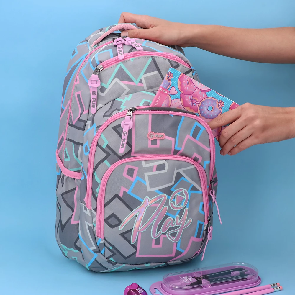 Cosmo, backpack ergo, Letters: a trendy grey backpack with pastel geometric print. Offers multiple zip compartments, bold “Play” embroidery, contrasting pink piping with oversized zipper pulls, and a padded top handle. Durable fabric and clean finish ensure daily reliability and strong shelf appeal.