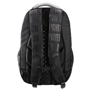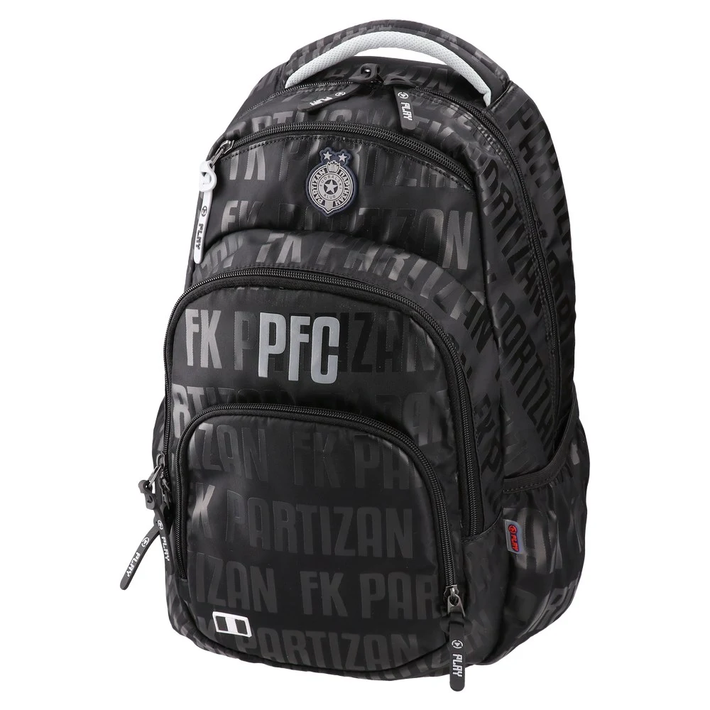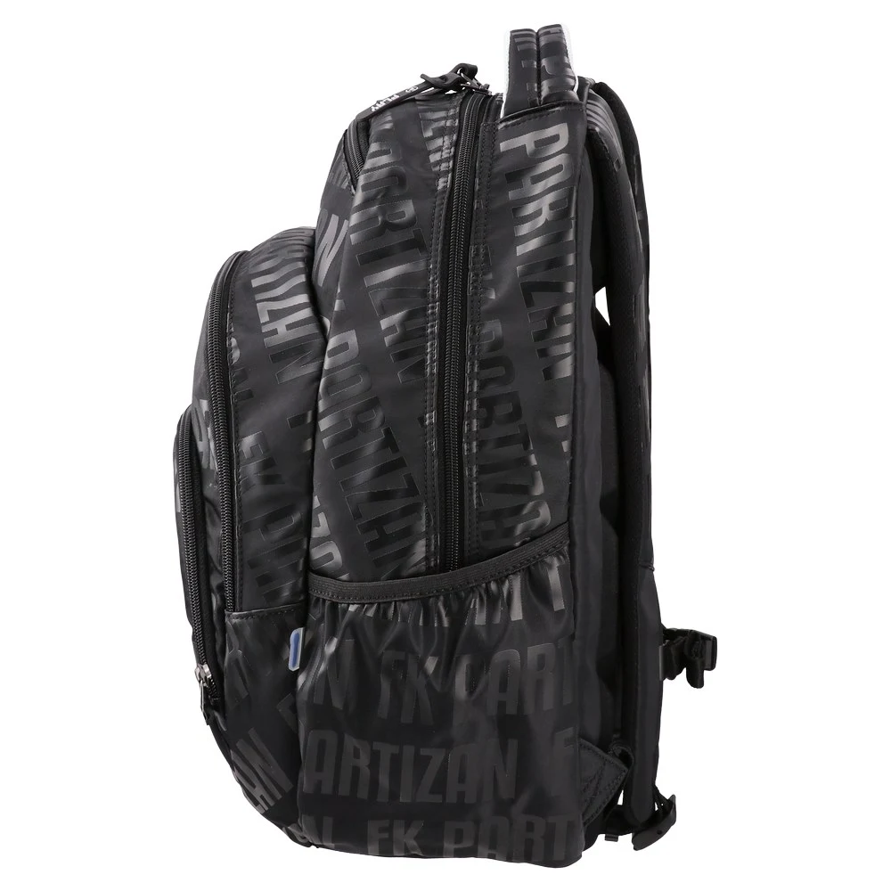Cosmo, backpack ergo, Partizan, Shadow Strike: sleek black daypack with tonal FK PARTIZAN pattern, silver PFC detail and crest badge. Durable fabric, reinforced padded top handle, multiple zip compartments and a front pocket. Precise stitching and smooth zips. All-over branding ensures strong shelf impact.