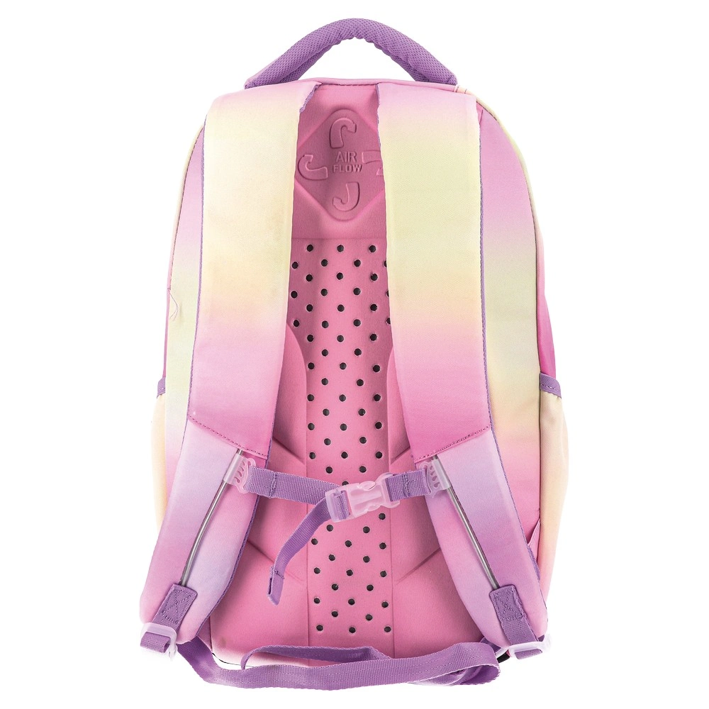 Cosmo, backpack ergo, Sunset only. Trend-led backpack with a pastel sunset gradient. Durable fabric, large main compartment, two front zip pockets, side pocket, and zipper pulls. Padded top handle and sleek stripe accent. Retail-ready design for school and daily carry.