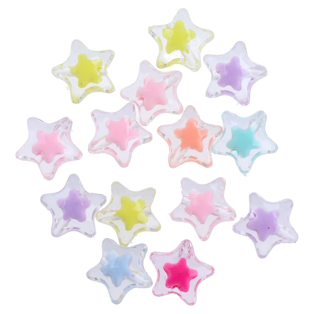 Crafty pearly, craft beads, stars, mix, 14g. Transparent star beads with pastel inner stars for a trendy jelly look and high-gloss finish. Consistent shapes and smooth edges support quality results. Mixed colors add visual impact for jewelry, accessories, and decorative craft lines.