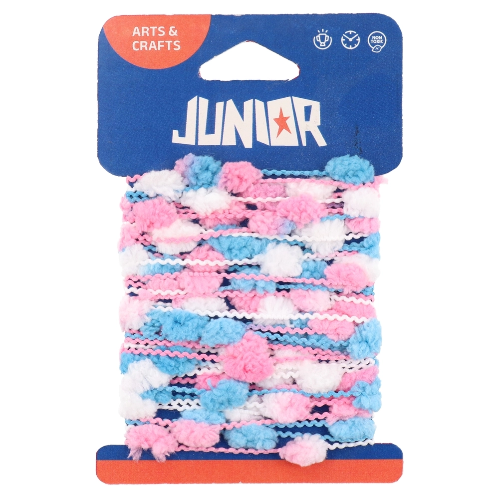 Soft pom pom trim ribbon in pastel pink, blue and white for trendy craft accents. 5 m continuous length delivers flexible application on cards, gift wrap, and decor. Non-toxic. Supplied on a hang-ready card for clean merchandising and strong shelf appeal.