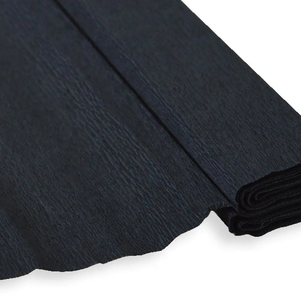 Black crepe paper sheet, 50 x 200 cm. The textured surface offers a contemporary look and folds cleanly for visual merchandising, gift wrapping, and event décor. Uniform black color supports professional presentation. Versatile, retail-ready material for crafts and displays.