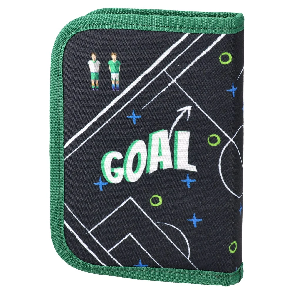 Decker, full pencil case, 1 zip. Trendy soccer design with “GOAL” print on a black textile cover, green piped edges, and a single perimeter zipper. Eye-catching and marketable for school assortments, offering durable daily use and a clean finish that elevates perceived quality.