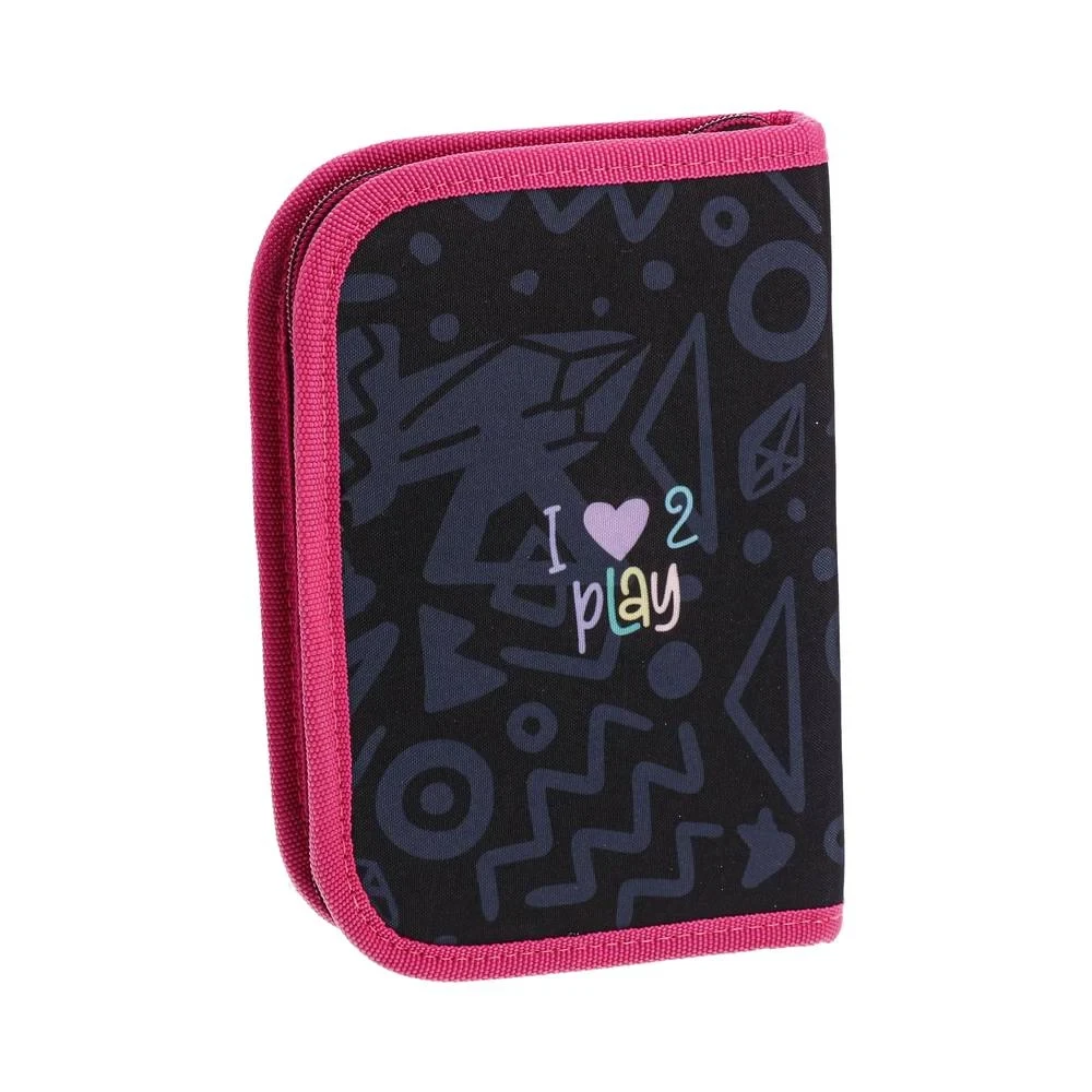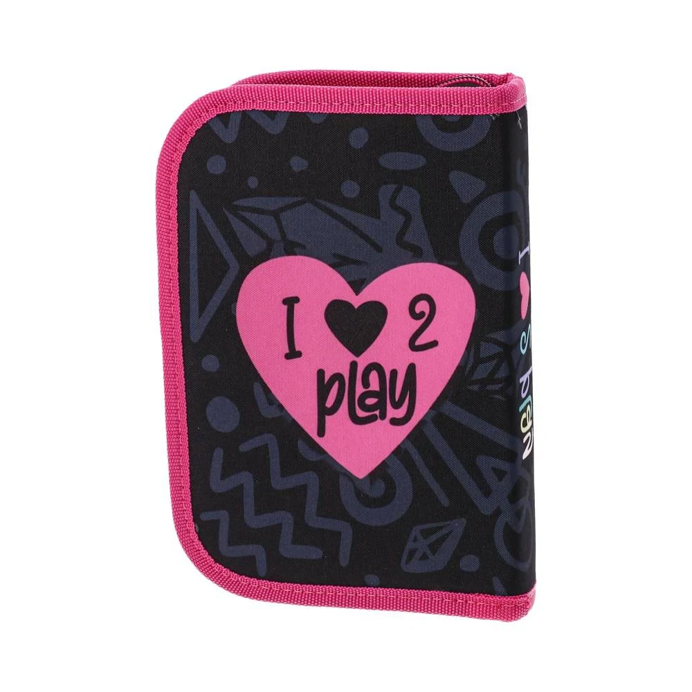 Decker full pencil case with 1 zip. Trend-right black base with tonal geometric pattern and a bold pink heart ‘I ? 2 play’ graphic. Reinforced pink edging and rounded corners for durability. Compact, secure closure for daily school use; strong shelf appeal for youth assortments.