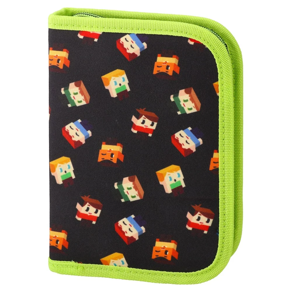 Decker, full pencil case, 1 zip, Isometric. Trend-forward book-style case featuring a black cover with colorful isometric pixel characters. Contrasting lime edging and a single-zip closure. Fabric build with neat finishing. Pre-filled and shelf-ready for school assortments.