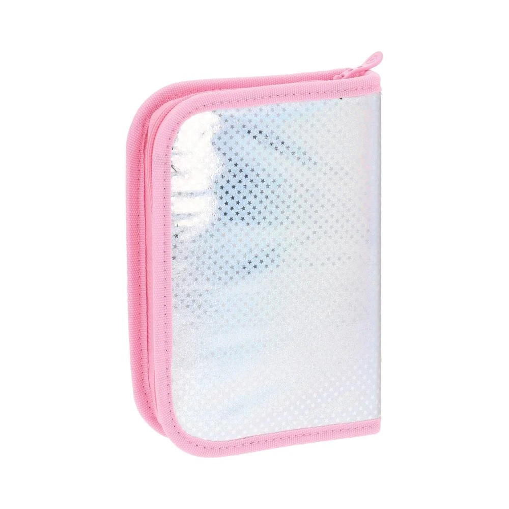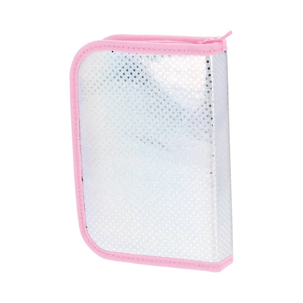 Decker, full pencil case, 1 zip, Stars. Iridescent silver cover with allover star pattern and pink trim delivers a trendy, high-visibility finish. Single smooth zipper and reinforced edging ensure dependable use. Book-style profile displays well; ideal for school ranges and gifting.