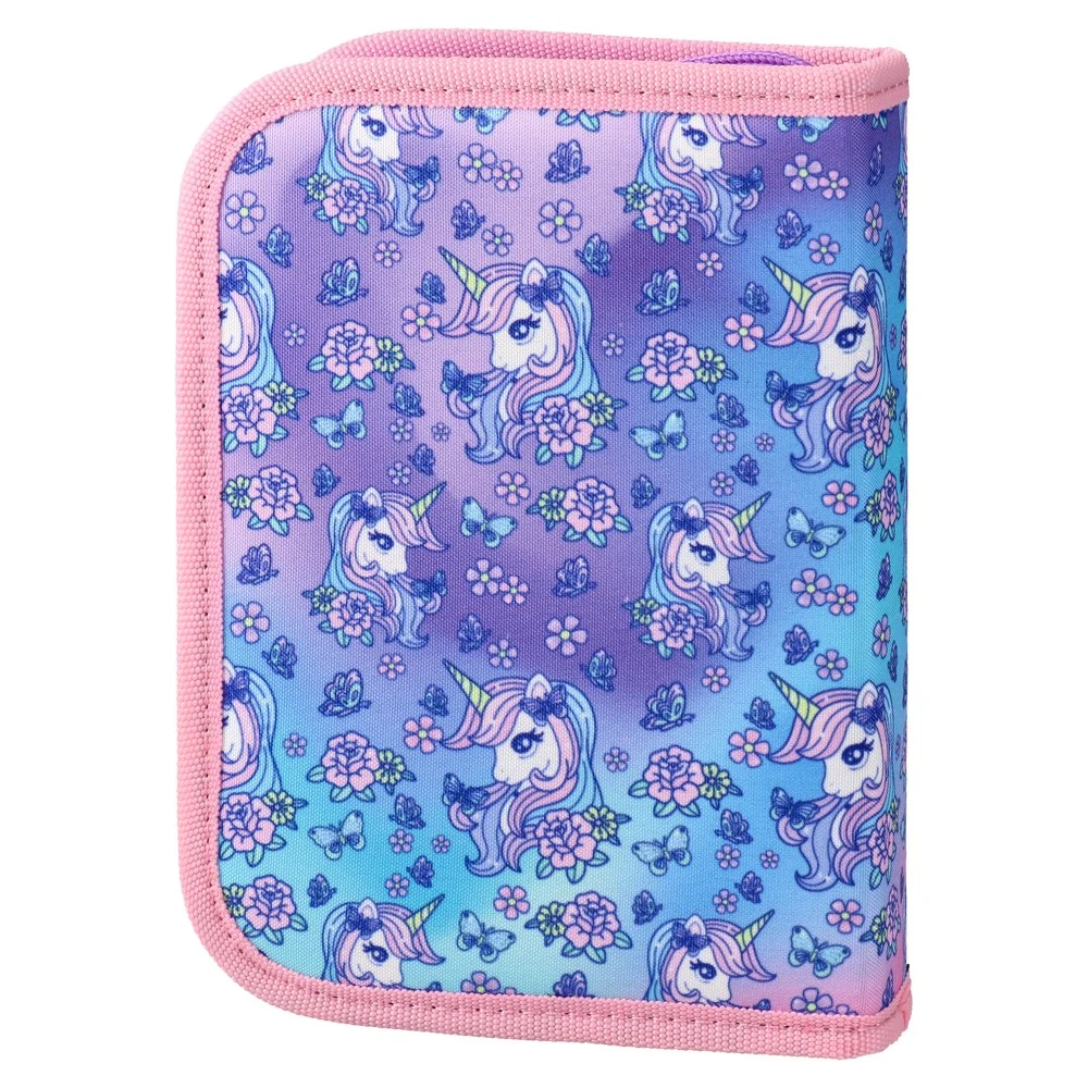 Trendy pastel gradient pencil case featuring an all-over unicorn, flower and butterfly print. Durable textile cover with neat binding and a smooth single-zip closure. Compact, book-style format that merchandises well and withstands everyday school use.