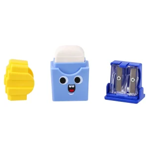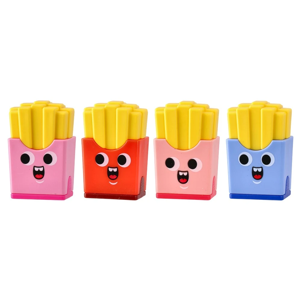 Dos 106, eraser and dual sharpener, french fries, mix. Playful snack-inspired design in assorted bright colors with cheerful faces. Compact piece combines an eraser and two sharpening sizes. Eye-catching, trend-led stationery ideal for school retail and gifting.