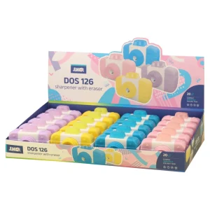 Dos 126 is a dual-function sharpener with eraser styled as a retro camera. The plastic body and pastel color mix deliver a fresh, collectible look that stands out on shelf. Reliable sharpening and erasing make it a strong choice for curated stationery assortments.